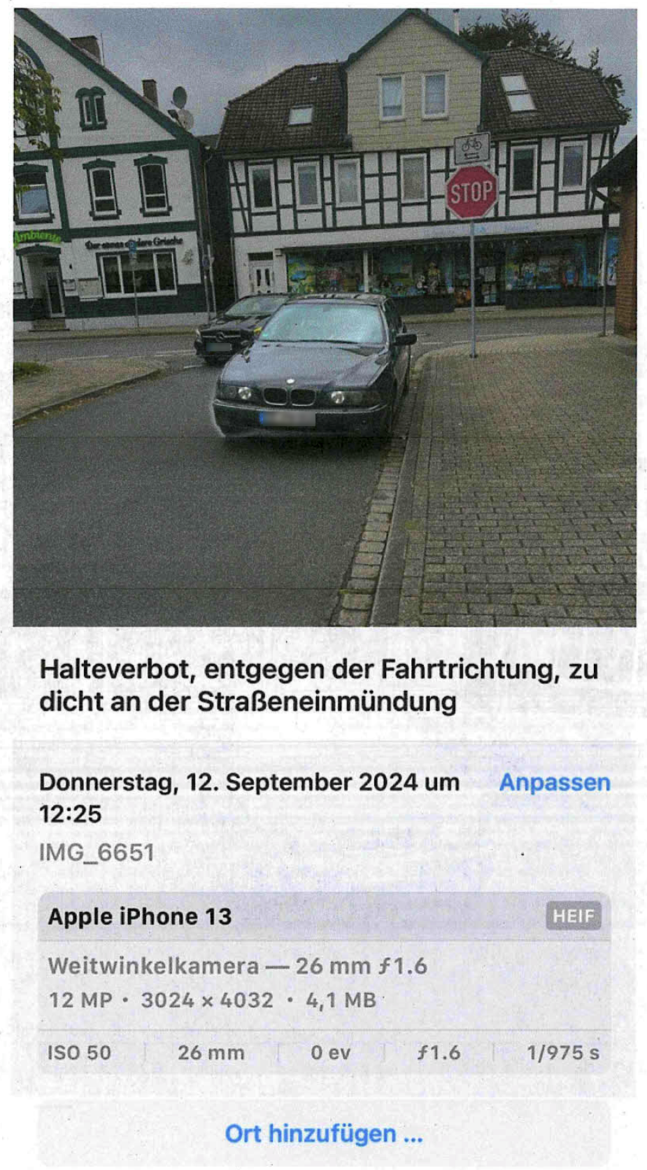 Gut dazu passt auch, dass Herr Oelmann offensichtlich keinen blassen Schimmer bezüglich dem Abschätzen von Entfernungen und dem Lesen von (nicht vorhandenen) Verkehrszeichen hat. Denn in dem nun vom Landkreis übermittelten Beweisfoto hat Herr Oelmann zum einen gemeint, ein Halteverbot zu erkennen und zudem gemeint, der von der StVO vorgegebene Mindestabstand zur Einmündung wäre unterschritten... ja ne... is klar ![]()
