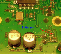 Im Weiteren muss auf der Platine ein Widerstand ausgelötet werden. Ich möchte die Originalkapsel bezüglich ihrer Stromversorgung so lassen. Also muss die Stromversorgung der Kapsel auf der Platine stillgelegt werden. Der genannte Widerstand befindet sich direkt unterhalb des negativen Kapsel-Lötpunktes (siehe Pfeil).